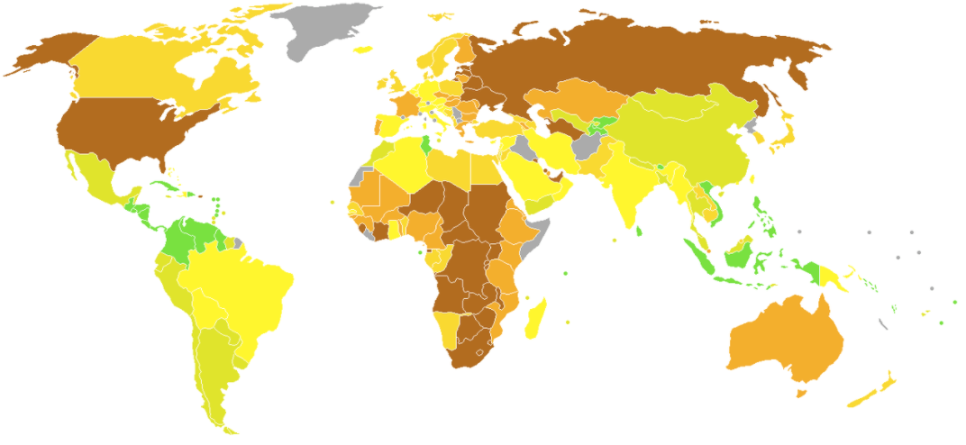 Зеленым цветом выделены счастливые страны, коричневым – несчастливые.
